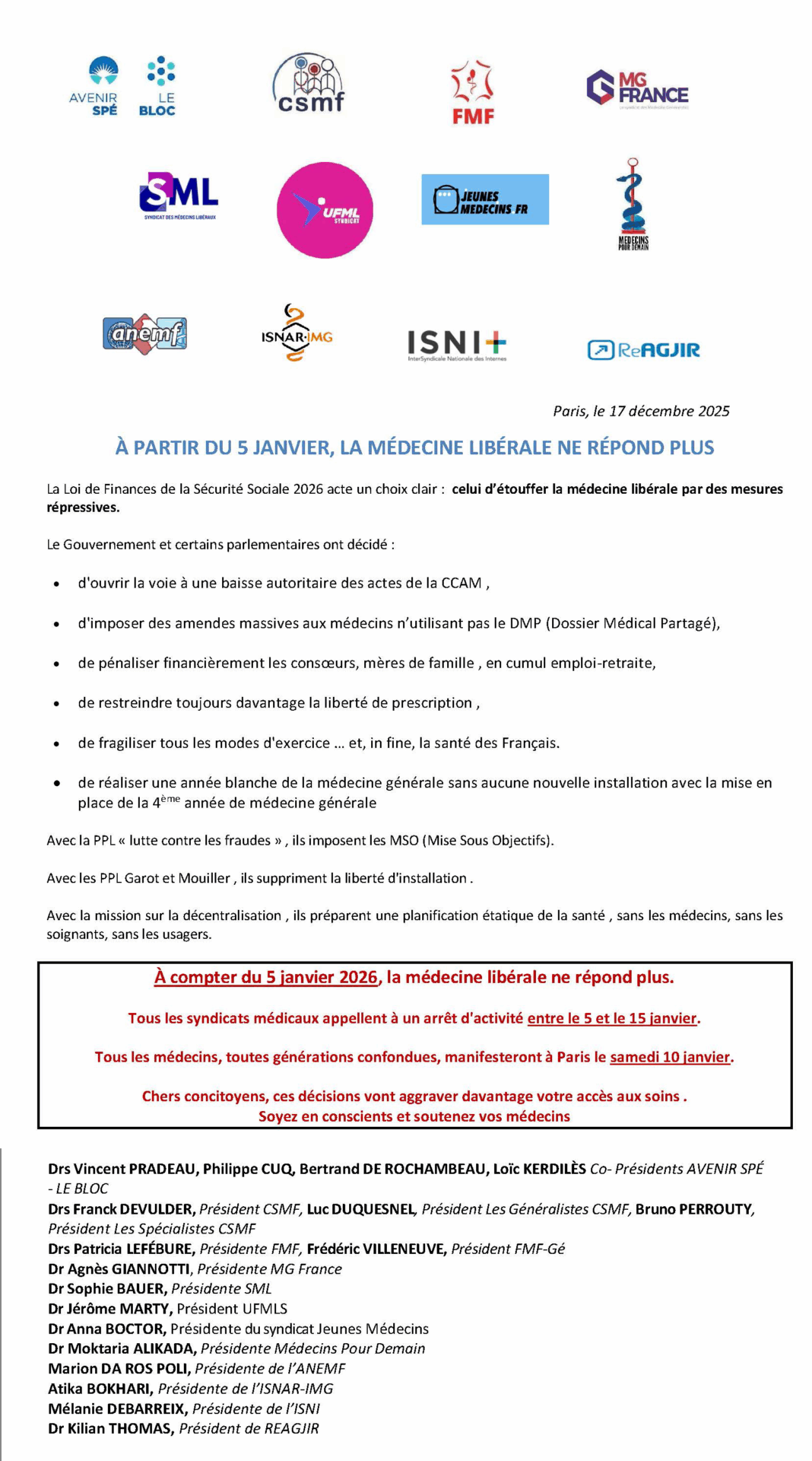 Au lendemain de l’adoption du PLFSS 2026, les syndicats et associations de médecins libéraux et d’internes dénoncent des mesures répressives contre la médecine libérale et lancent un mouvement de mobilisation à partir du 5 janvier 2026.