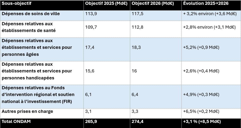Le montant de l’Ondam général pour 2026 est fixé à 274,4 Md€, ce qui représente une augmentation de 3,1 % par rapport à l’objectif pour 2025, et réparti comme suit (en milliards d’euros) :